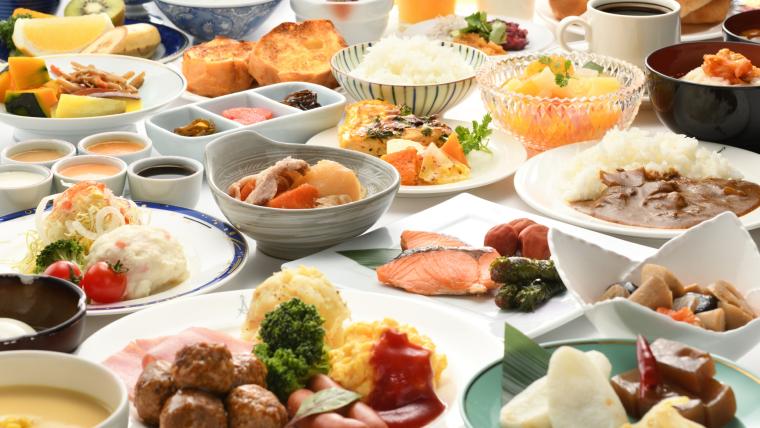 朝食は夕食と同じ「里山ダイニング」で。約40種類もの和洋メニューが並ぶバイキングは、旅の朝を豊かに彩ります。