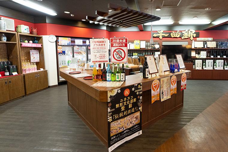蔵元には「酒蔵 千曲錦」が併設されており、「大吟醸 酒の精」など好きなお酒を5杯(1杯35mL) 550円で試飲でき、試飲に使用したネーム入りのグラスは持ち帰り可能。もちろん、試飲して気に入ったお酒はその場で購入することもできますよ。