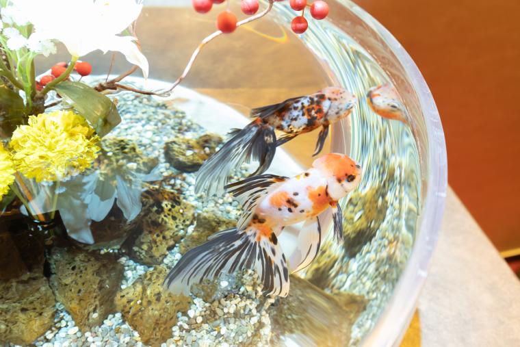 日本庭園になじみ深いデメキンが、睡蓮鉢の中で優雅に泳いでいる姿も。