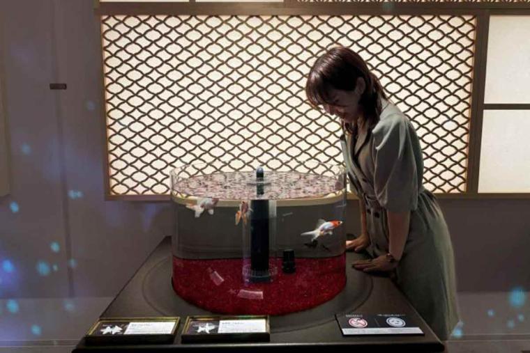 「PLANETS-奇跡の惑星」と同じフロアながら、世界は一転。次に現れる「MIYABI-和と灯の間」は、和の趣たっぷりな空間です。舞台の周りには本物の錦鯉が泳いでおり、餌やり体験も可能。