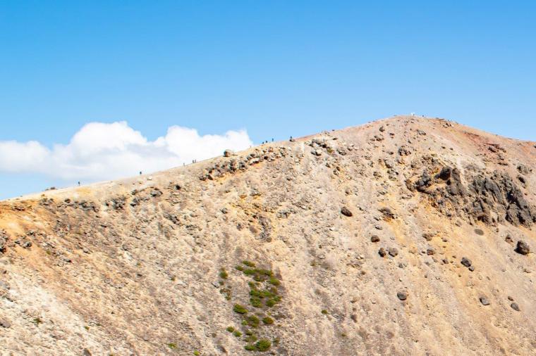 登山口から頂上までは階段を上って約15分。火口の縁には石や小さな岩が転がりゴツゴツしているので、歩きやすい靴で訪れるのがおすすめです。