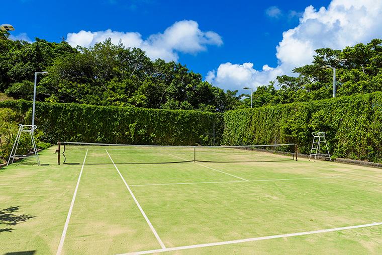 アクティブに過ごしたい人には、無料で利用できるテニスコートがおすすめ。全天候型オムニサンドグラス仕様なので、スコール後も20分ほどでプレー可能に。涼しい時間帯のナイタープレーも人気です。
