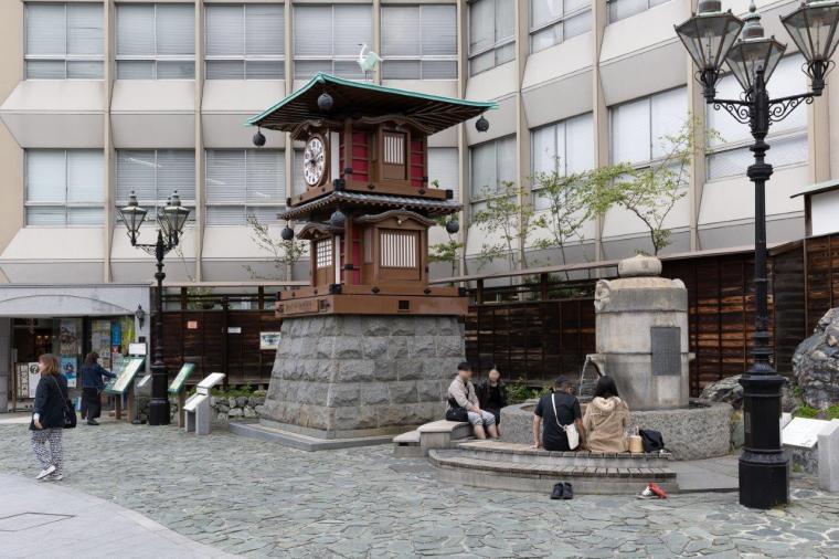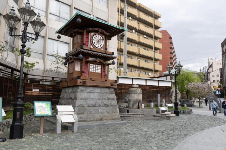 駅を出てすぐの場所には、道後のシンボル「坊っちゃんカラクリ時計」があります。8:00~22:00までの1時間ごと(土曜・日曜・祝日及び特別期は30分ごと)にカラクリが動き、夏目漱石の小説『坊ちゃん』の登場人物たちが登場します!