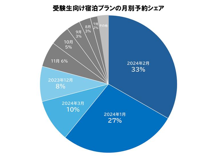 実際に楽天トラベルで、宿泊施設が受験生向けに販売している宿泊プランの予約実績の月別シェアを見てみても、2023‐2024年では2月が33%、1月が27%と6割を占めています。そのため、いざこの時期に予約しようとしても条件のいい宿泊施設はすでに埋まっていることが多く、理想的な宿泊先が確保できないケースは少なくありません。