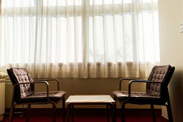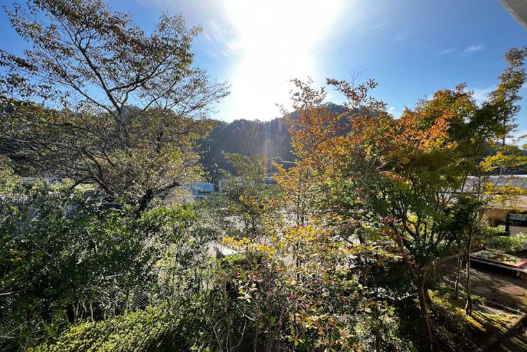 お部屋の奥には大きな窓と広縁が。小さなテーブルと一人掛けのソファーがあるので、日差しを浴びながらゆったり過ごせます。窓の外には、奥久慈の自然が広がっていますよ。少しずつ紅葉が始まる時期だったのですが、秋真っ盛りはきっともっときれいでしょう。