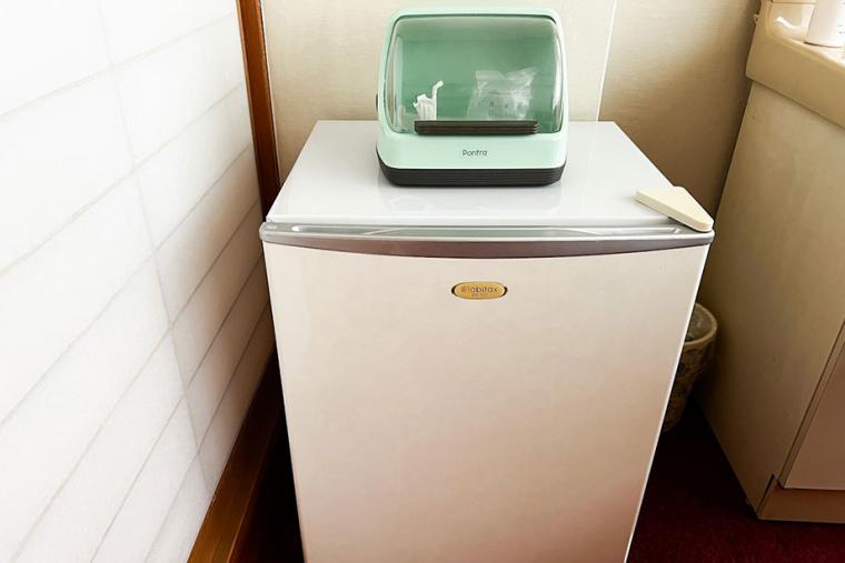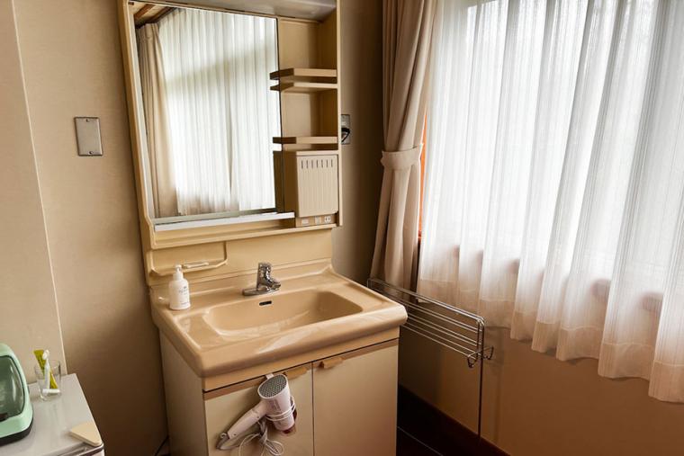広縁には、独立した洗面台、トイレ、冷蔵庫も置いてあります。冷蔵庫は持ち込み用なので、中は空っぽでした。お部屋にはお風呂はありませんのでご注意を。