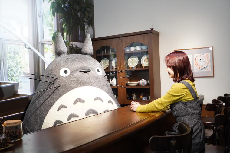 バーカウンターにちょこんとかわいいトトロが。まるでトトロのお店に来たみたい。隣には大きなトトロとネコバスの椅子もあります。さらに、このエリアを抜けると……