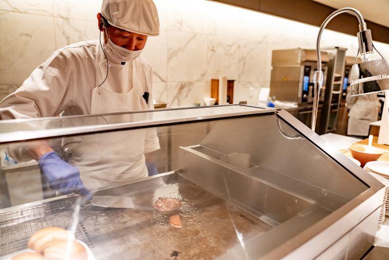 ライブキッチンコーナーでは「グラフォアビーフバーガー」を焼きたてで提供。バンズにこんがり表面を焼いたグラフォア&ビーフパティを挟み、トリュフソイソースをかけていただきます。グラフォアとは鶏レバーで、トリュフがぜいたくに香る濃厚なソースと相性抜群でした。