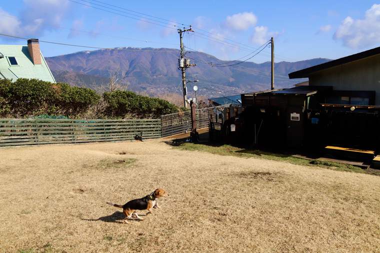 ジェリーも大好きなドッグランは全部で4ヵ所。メインのドッグランは300坪の広さを誇り、遠くには箱根連山のパノラマビューも。