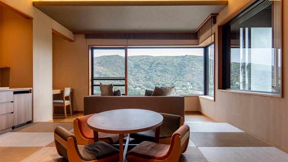 風流な宿の雰囲気に和みつつ、ロビーラウンジでチェックイン。豊かな緑に癒やされる空間で、東には芦ノ湖や箱根神社の鳥居、西には二子山を見渡せます。
