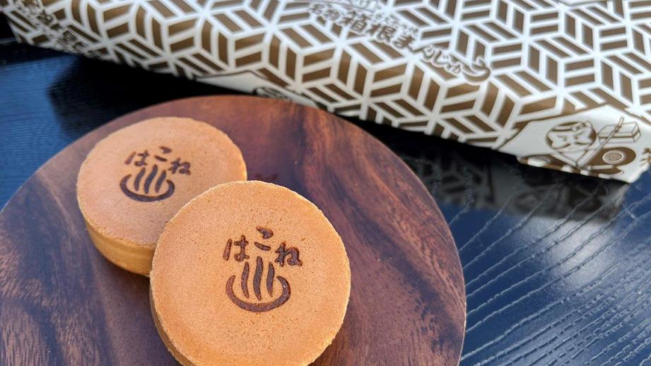 温泉マークと「はこね」の文字がレトロでかわいい!温泉街を背景にまんじゅうを手に持って写真撮影するのもおすすめです。