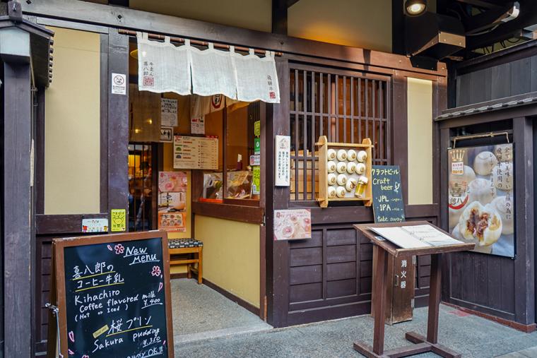 食べ歩きできる飛騨高山グルメ、1つ目は、飛騨牛を気軽に楽しめる牛まんのお店「牛まん喜八郎」をご紹介します。人気なのは「喜八郎牛まん」(560円)。飛騨牛をたっぷりと使った牛まんは、噛むごとに肉汁がじゅわ~っと口中に広がります。ほかに、黒ゴマをたっぷり使った「黒ごまあんまん」(350円)もおすすめ。