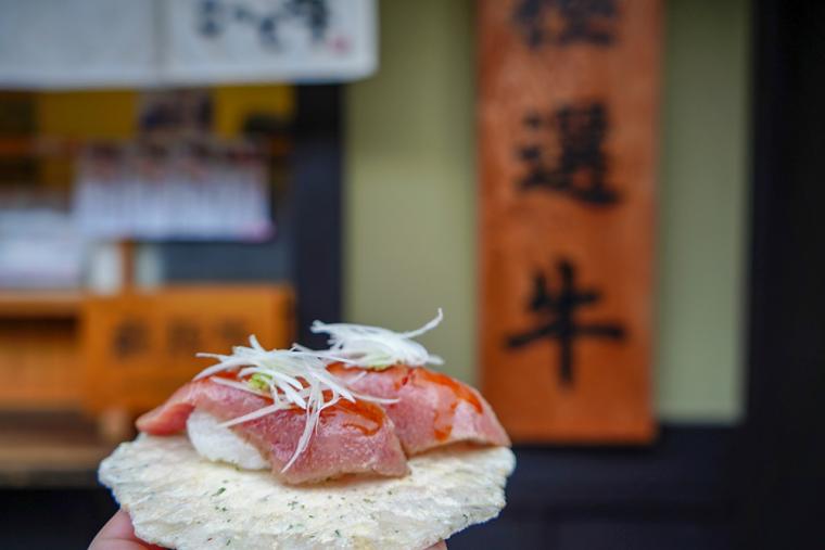 もうひとつ、飛騨牛を気軽の楽しめるお店が、飛騨牛を握りでいただく「飛騨 こって牛」。お寿司なのに、食べ歩きグルメ?と驚くのですが、海老せんべいの上に、飛騨牛の握りを乗せて提供してくれるのが飛騨高山の食べ歩きスタイル。注文してから握ってくれるので、おいしい状態で食べられますよ。