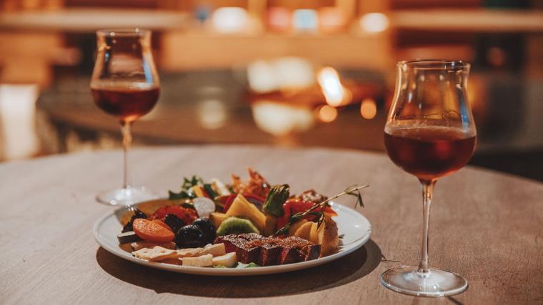 メインは、厳選された国産牛のステーキ。ナイフを入れると、柔らかくほどけるような食感に思わず笑みがこぼれます。お肉に合うワインが飲みたくなりますが、オールインクルーシブだから、ワインも好きなだけ。料理に合わせて、好きなお酒をペアリングできるのが、ディナーの大きな楽しみです。