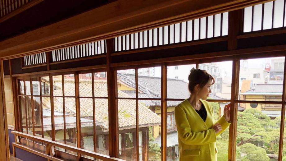 そこで私が使ったのは、三角構図。画面に安定感を出したいときや、奥行きを表現したいときに使われる方法で、高い木や奥に伸びる道などを三角形に配置する方法です。 今回は、窓枠と、その奥の建物を三角を意識した角度で撮影してみました。 こうすると、日本庭園の緑だけではなく、奥行きのある広がりも感じてもらえるかと思います。