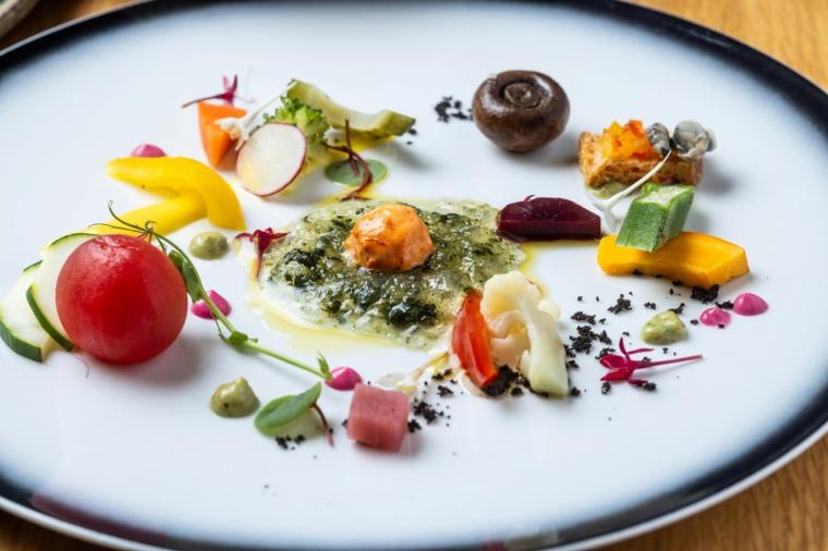 中でも目を引いたのが、まるでアートのようなシグネチャープレート「IZUMO」。コースの中で唯一変わらない、特別な一皿です。夕日が沈む出雲の海を表現しており、中央のオレンジ色のパプリカムースは夕日をイメージ。まわりには海に見立てた昆布ジュレや、砂浜を思わせる黒オリーブのパウダーが美しく盛られています。