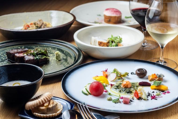 奥出雲町産の出雲しいたけを使ったポタージュや、砂糖漬けの出雲生姜を添えたフォアグラ最中を皮切りに、三瓶山の湧き水で育った三瓶サーモンの前菜、大社漁港で獲れたサワラを多伎町名産のイチジクの葉で包んだ温菜、しまね和牛と奥出雲産の舞茸をマデラソースで仕上げたステーキ、さらに石見ポークのパスタなど、どれも島根の食材を存分に生かした料理が並びます。