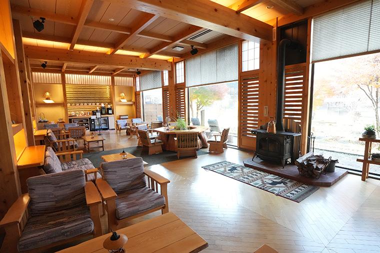 チェックインはウェルカムドリンクをいただきながら、木の温もりがあふれるロビー・ラウンジ「最暖」で。木曽御嶽山麓から伐採された、樹齢千年以上の巨木サワラの原木から作られた「日本一の夫婦囲炉裏」テーブルや、薪ストーブが出迎えてくれます。