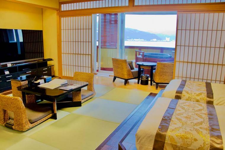右手には相模湾、左手には伊東の町並みを見渡す「ラグジュアリー 和 ホテル 風の薫UMI」。