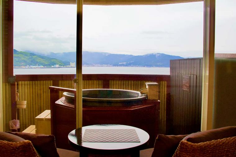全室がバルコニー付きなので、磯の香りを含んだ風にあたれば海の気配をより実感するはず。耳をすませば、信楽焼きの露天風呂に注がれる温泉の音とさざ波が重なり、水の音色に気持ちも和みます。