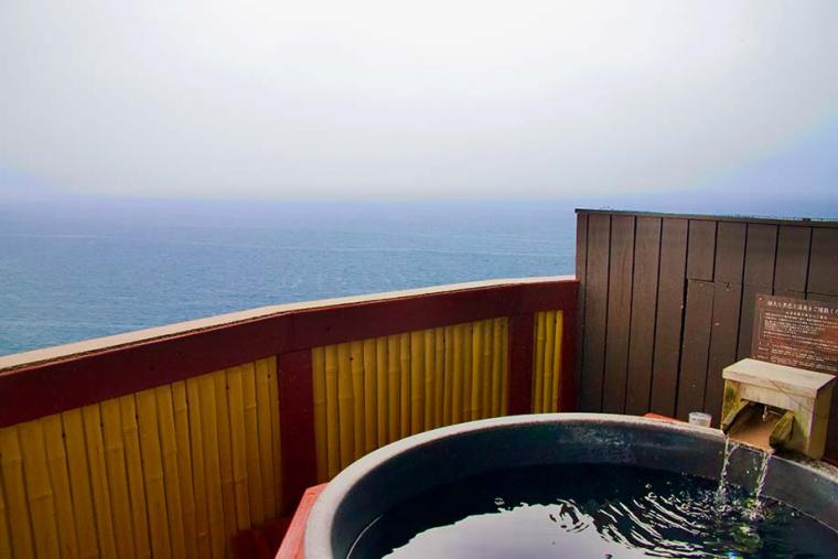 最上階には2つの貸切温泉(無料)があり、どちらも浸かってみたいところ。絶景露天風呂「薫」は、窓から水平線が望め、まるで空に浮かんでいるよう。空と海が織り成す、壮大な景色を存分に堪能できます。