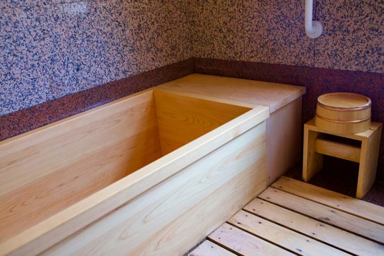 露天風呂に加え、古代檜を使用した内風呂も完備。人にも環境にも優しい製品づくりを謳うマーガレットジョセフィン社のボディソープ、シャンプー、トリートメントも備え付きです。