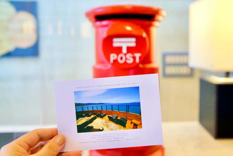 また客室にはハガキが用意されていて、メッセージと宛先を記入して2階ロビーのポストに投函すると、1年後に届く仕組み。そのハガキを持参すれば特典も受けられるので、未来の自分たちに宛てた文章がそのまま再訪の約束になります。