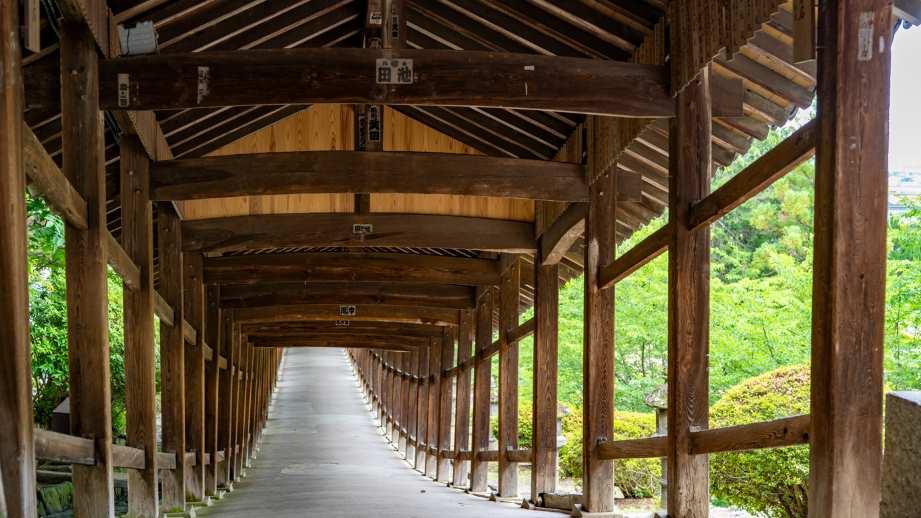 拝殿の右手に位置する約398mの廻廊。地形に沿って建てられた一直線の造形美に圧倒されます。天正元(1573)年から約20年間かけて造られ、現在は岡山県の重要文化財に指定されています。