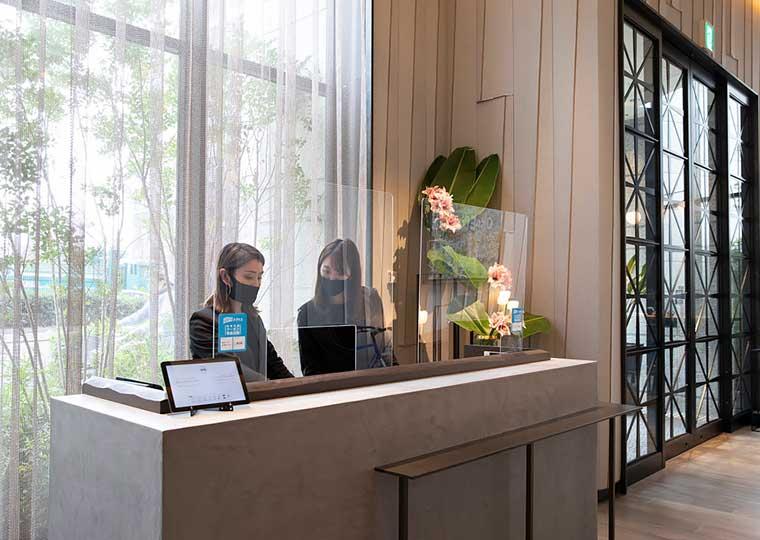 何かと会話が必要なフロントには、クリアパネルを設置し、飛沫を防ぐ対策を徹底しています。