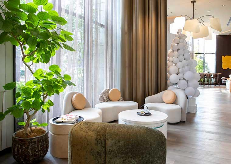NYのアートシーンからインスピレーションを受けたというこのホテルは、まるでアートギャラリー。エントランス以外にも、館内を散策するとあちこちで絵画やオブジェなどの作品に出合うことができました。移動のたびに、感性を刺激されます!