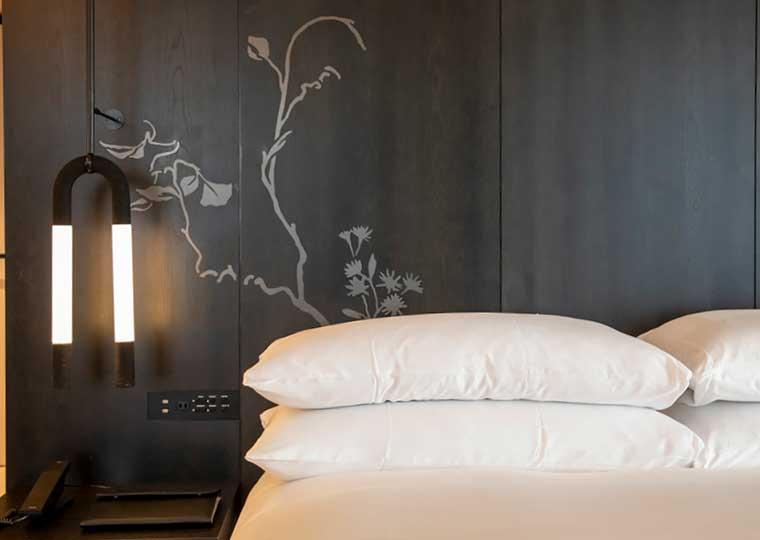 和をモチーフにしたあしらいも印象的で、ベッドサイドのライトは、日本の伝統的なかんざしをイメージしたもの。ベッドボードには墨絵を思わせるような花の絵が添えられていますが、これは「ゲスト一人ひとりがそれぞれのインスピレーションで、自国の花を思い出したり想像したりしてほしい」という思いから、あえて実在しない花を描いています。