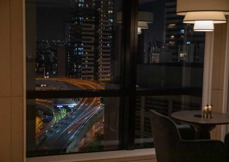 天井から足元まで続く全面窓から見られるのは、優美な曲線を描きながらどこまでも続く首都高速道路。ここが東京の中心であることを、思い出させてくれます。