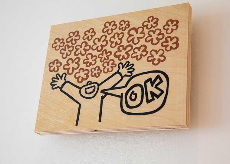 色とりどりの色彩の中には、「おかえり」や「ようこそ」を世界中の言葉で表現。よく見ると「OkaEri」「Yokoso」といった文字が浮き上がるように見えてきます。そんなユニークなアートに、さっそく好奇心をくすぐられます。
