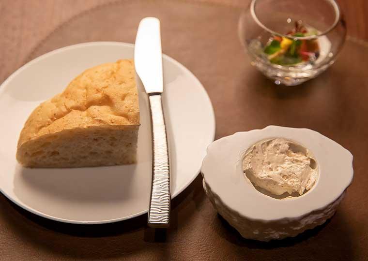 始めにアミューズを。一緒にサーブされたパン用のバターは、醤油麹が加えられている新感覚の味わいで、感動もの! まろやかで食べやすく、たっぷり塗ってもくどさがありません。