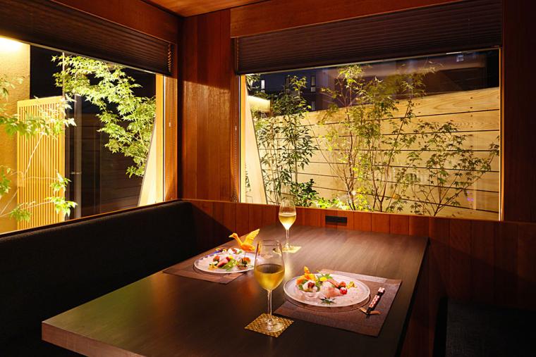 2024年9月には個室の食事処を新設。竹林や水盤の水を揺らす道後の風を感じながら、プライベートな空間で食事が楽しめます。夜は中庭や室内の照明が穏やかで柔らかい雰囲気を演出します。