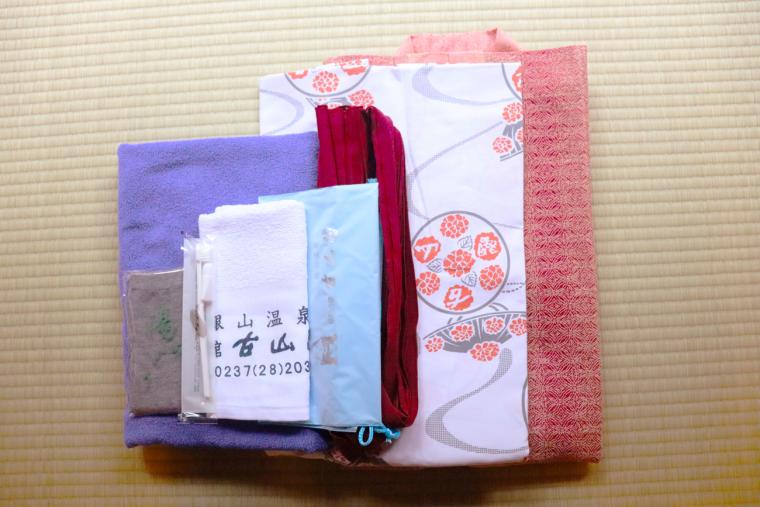 客室には、浴衣と羽織、つま先が割れた足袋型の靴下がありました。この靴下があれば、下駄を借りてそのままお出かけできます。バスタオルとフェイスタオル、歯ブラシのほか、湯籠がありました。