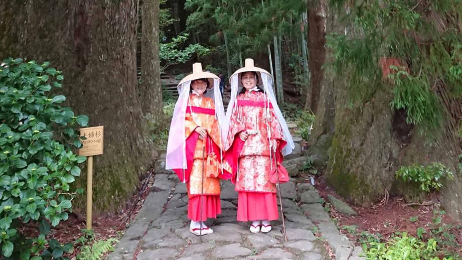 夫婦杉の樹齢は約800年といわれ、高さは35m以上。圧倒的な存在感を放つ夫婦杉の間を通り、更に奥へと進みます。衣装は夫婦杉周辺での写真撮影コース(ひとり2,000円)のほか、そのまま参道を歩いて熊野那智大社まで向かうコース(ひとり3,000円)もあります。