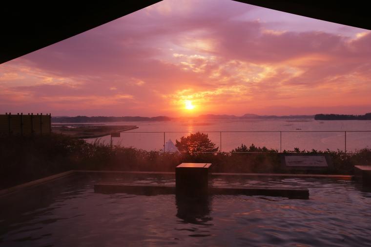 時間帯や天候によって表情を変える景色は、まるで一枚の絵画のよう。歩きながら眺める松島とは異なり、最上階の温泉からはより遠くの島まで望め、貴重な体験になりました。