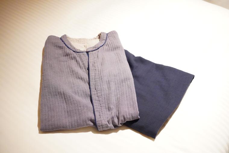 館内着は、上下に分かれたオリジナルリゾートウェア。肌に心地いいガーゼ生地で、ふんわりと軽やかな着心地です。(※ショップで購入可能)
