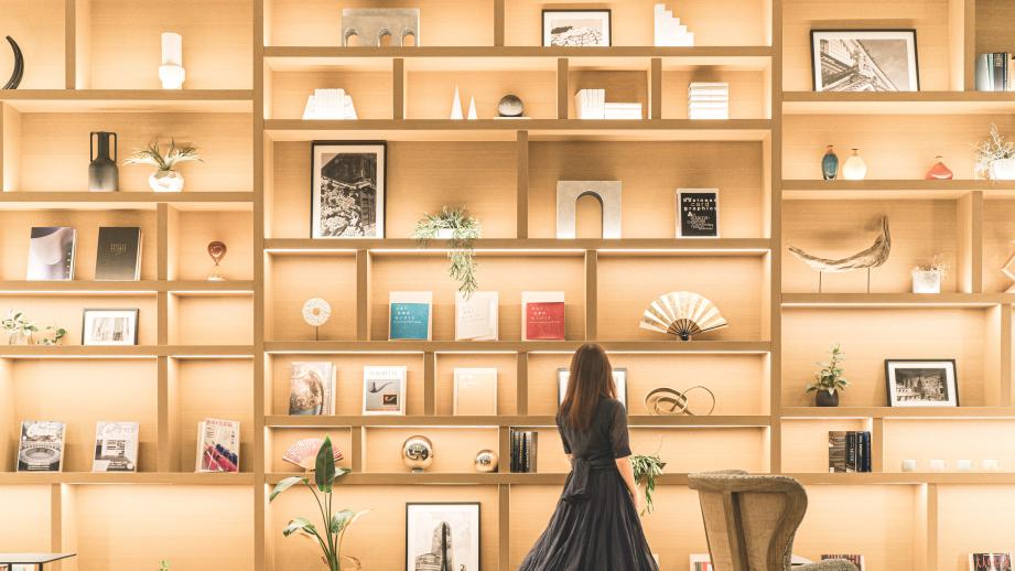 同場所には天井まで続く本棚があり、厳選された調度品がズラリと並びます。圧倒的な存在感で、こちらも写真映えするスポットです。