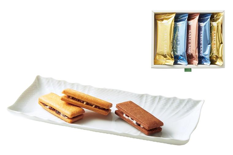パティシエとして世界的に有名な柴田武さんのお店「シェ・シバタ」。サブレサンドはバター風味たっぷりのサブレを使用した贅沢なサンド。ラムレーズン&マダガスカルバニラ、ショコラサブレ&クランベリーに塩キャラメル&ヘーゼルナッツの3種類の味があります。細長くスタイリッシュな見た目とかわいらしい箱に入っているため、かわいいものが好きな方へのお土産にもぴったりです。