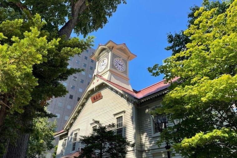 札幌市中心部に戻り、有名な札幌市時計台へ。北海道大学の前進である札幌農学校の演武場として1878(明治11)年に建てられ、札幌の歴史とともに歩んできました。国の重要文化財に指定されており、札幌を代表する建物です。