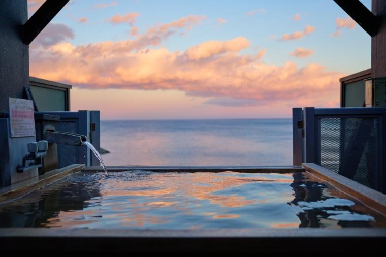 夕食前に眺望が一番と言われる本館屋上へ。高野槙を使った「海」など浴槽のデザインはそれぞれ異なりますが、4か所すべての露天風呂からは海を一望でき、自由に開閉できる屋根とフェンスで開放感も抜群です。