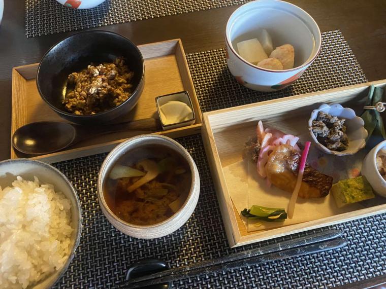 朝食は、和定食。丹波篠山産の「デカンショ米」の炊き立てご飯に、丹波篠山の郷土料理「とふめし」、丹波篠山の黒豆入りのお味噌汁と、地元の食材をふんだんに使った料理が並びます。
