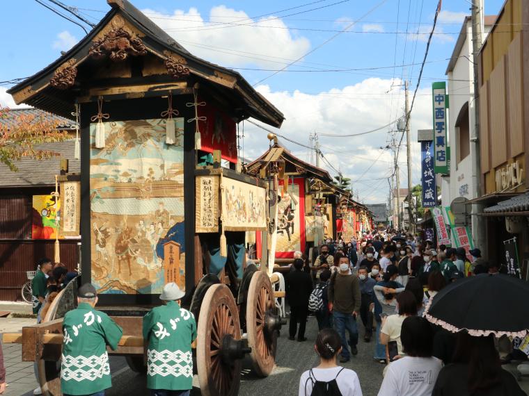 丹波篠山の歴史文化に触れたい方は、毎年秋に行われる「春日神社秋祭り参加体験」がおすすめ。2017年に丹波篠山市の無形民俗文化財の指定を受けた篠山三大祭のひとつで、地元の方とともに鉾山(ほこやま)の巡行に参加できます。迫力ある鉾山の巡行を間近で見られるのは、観客として外から眺めるのとはまた違ったおもしろさがあります。