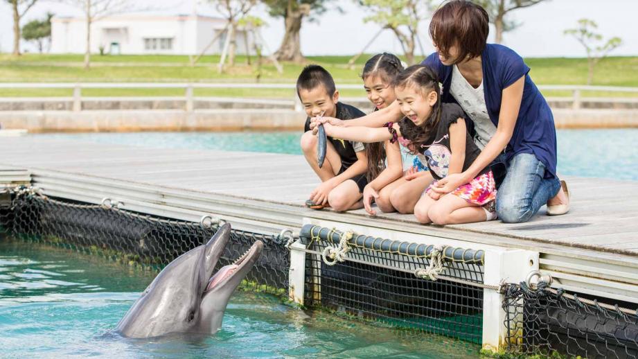 イルカと楽しく遊びながら学ぶことができるドルフィンプログラムが評判の「もとぶ元気村」。おすすめは親子で楽しめる「ドルフィンエンカウンター」。体長約3mのイルカに最初は驚く子も多いそうですが、おもちゃを使って遊ぶことで少しずつ慣れていくとか。また、膝まで水に入ってイルカと遊ぶことができます。小学生以上、身長125cm以上なら、イルカと一緒に泳ぐことのできるプログラムもあります! その他、マリンプログラム、文化交流館、自然体験、キッズランドなど多数の体験プログラムが用意されています。