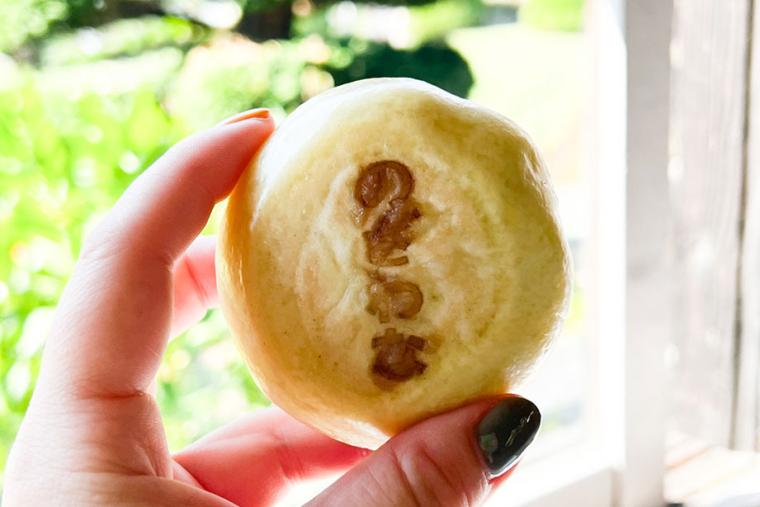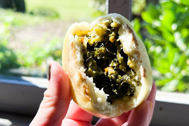 筆者も早速野沢菜のおやきを食べてみました。イートインにすると、その場でレンジでほかほかに温めてくれますよ。ふわふわの生地の中にはピリ辛の野沢菜フィリングがたっぷり入っていました!