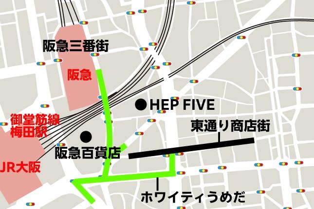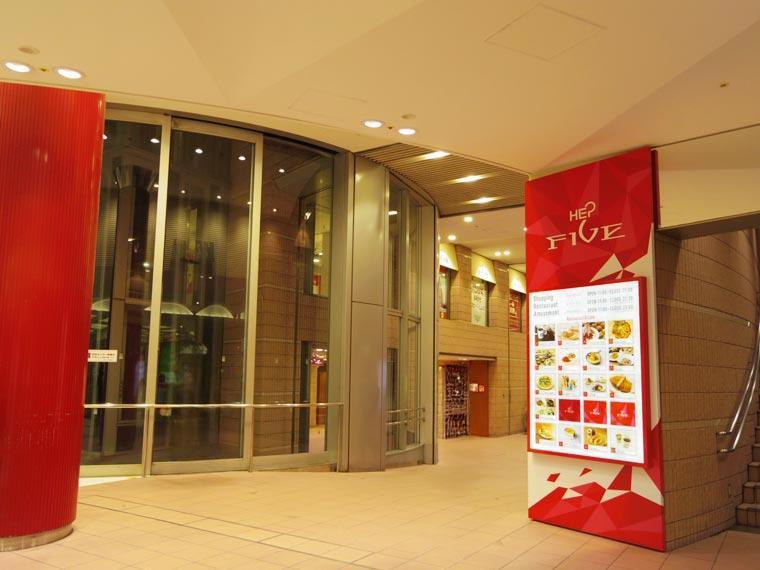 ホワイティうめだの北側、ノースモールに向かうと、「HEP FIVE」に出ます。観光におすすめなのは「HEP FIVE」の観覧車。空調完備なので、真夏や真冬でも快適です。赤い看板の入り口が目印です。