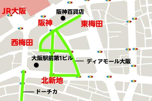 Dエリアは、四つ橋線西梅田駅を中心に、北へ行くと「阪神百貨店」、南に行くと中之島エリアに続く「ドーチカ」、大阪駅前ビル一帯をつなぐ「ディアモール大阪」が位置するエリアです。