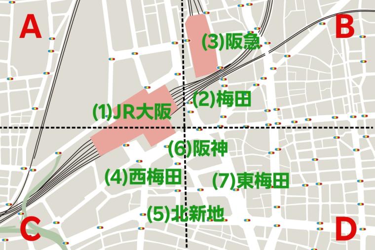 そこで、大阪・梅田エリアを理解するために、エリアを4つに分け、エリア別にマップで詳しく解説します。大阪・梅田地下街を中心とする「ダンジョン」を体系的に攻略しましょう!